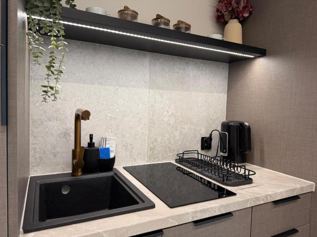 Apartament typu Suite z widokiem na miasto. The air-conditioned suite has 1 bedroom and 1 bathroom with a bath and a shower. The kitchenette features a stovetop, a refrigerator and kitchenware. The suite features a washing machine, a dining area, an electric kettle, a flat-screen TV, as well as city views. The unit has 1 bed. Apartament typu Suite - 2 osobowy. Powierzchnia pokoju ok.: 29 mkw. ;
